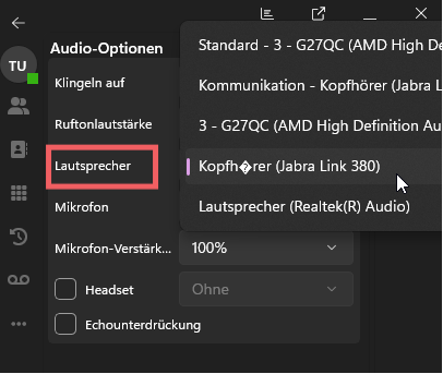 Stattdessen: ✔ „Kopfhörer (Jabra Link 380)“ auswählen