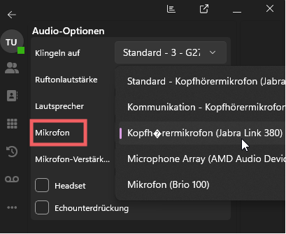 Unter „Mikrofon“ auswählen: ✔ „Kopfhörermikrofon (Jabra Link 380)“