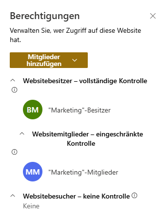 Dort findest du alle Berechtigungsgruppen wie Websitebesitzer, -mitglieder und -besucher